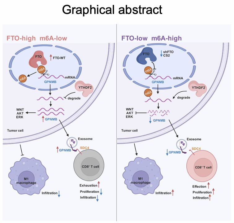 本研究通过HCC病患样本分析发现FTO在HCC中显著上调。体外实验证实敲低FTO显著抑制HCC细胞的增殖,迁移 和侵袭。体内敲低FTO显著抑制肿瘤生长和肺转移。另一方面,C57BL/6小鼠中敲低FTO增强了CD8+型T细胞的激活与募集以及巨噬细胞的M1极化。转录组和m6A测序筛选出由FTO介导m6A修饰的下游靶基因GPNMB,这个过程是由YTHDF2介导GPNMB的mRNA降解。IP和免疫金实验确认定位到外泌体表面的GPNMB蛋白通过与CD8+型T细胞表面受体蛋白SDC4直接结合并抑制其激活与募集。 总的来说,FTO下调下游靶基因GPNMB的mRNA上m6A水平,并通过外泌体形式抑制免疫细胞的激活与募集,最终促进HCC的发展进程。